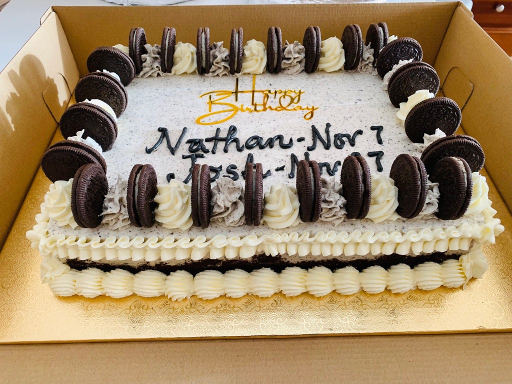 9×13, 2 layers Yellow Chocolate Ganache and Cookies and Cream Cakes.